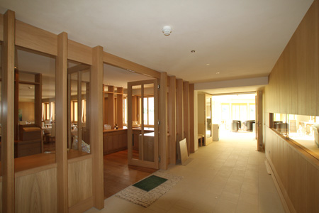 Von den konstruktiven Elementen der Stützen und Deckentafeln aus massivem Vollholz oder spezifisch gefertigtem Leim-Holz; vom astigen Gebälk bis zu schöngemaserten teilweise astfreien Schalungen, Bohlen, der Wandtäfelungen BIS schön geprägten Furnierbildern der Möbel, ES FASZINIERT das Holz hoher statischer Festigkeit, Eleganz, prägnant strukturierter Zeichenhaftigkeit, Suche nach Weiterführung, Übertragung historischer Sprache in Architektursprache der Zeit unter BEWAHRUNG von EMOTIONAL BESETZTEN BILDELEMENTEN: OHNE KOPIE.