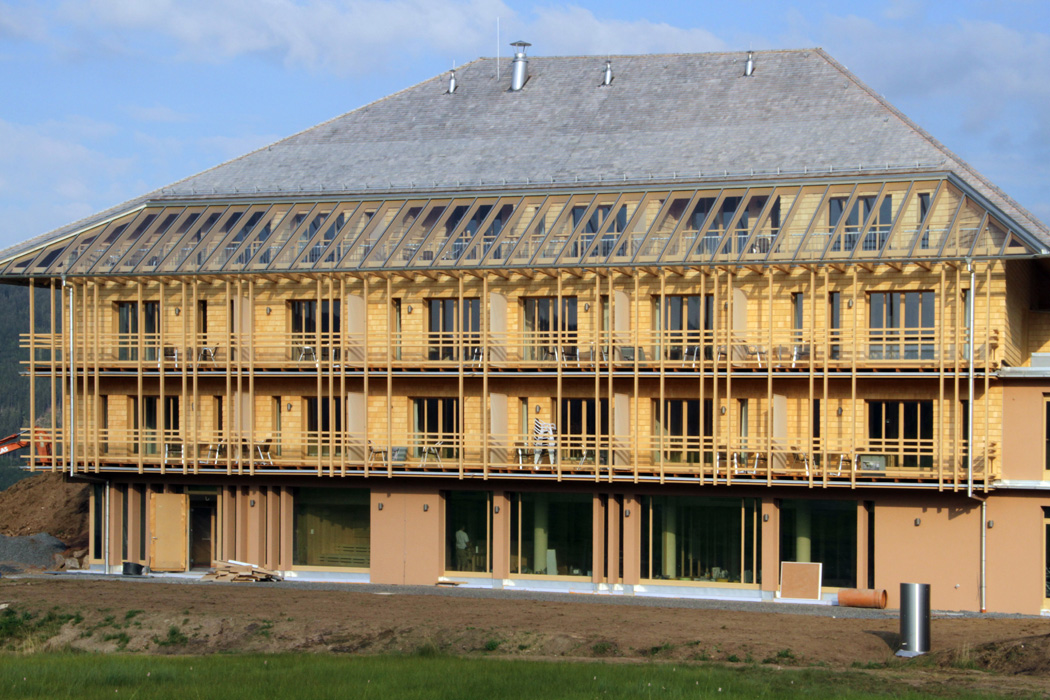 Fortgeschrieben ins Zeitgemäße ist auch diese Konstruktionsart und das alles bestimmende Baumaterial im Haus. Holz von Fichte, Tanne und Eiche – mehr als 1000 Festmeter wurden hier verarbeitet gestalterische Kraft und Schönheit des traditionsreichen wie MODERNEN Schwarzwälder Bau-Stoffes.
